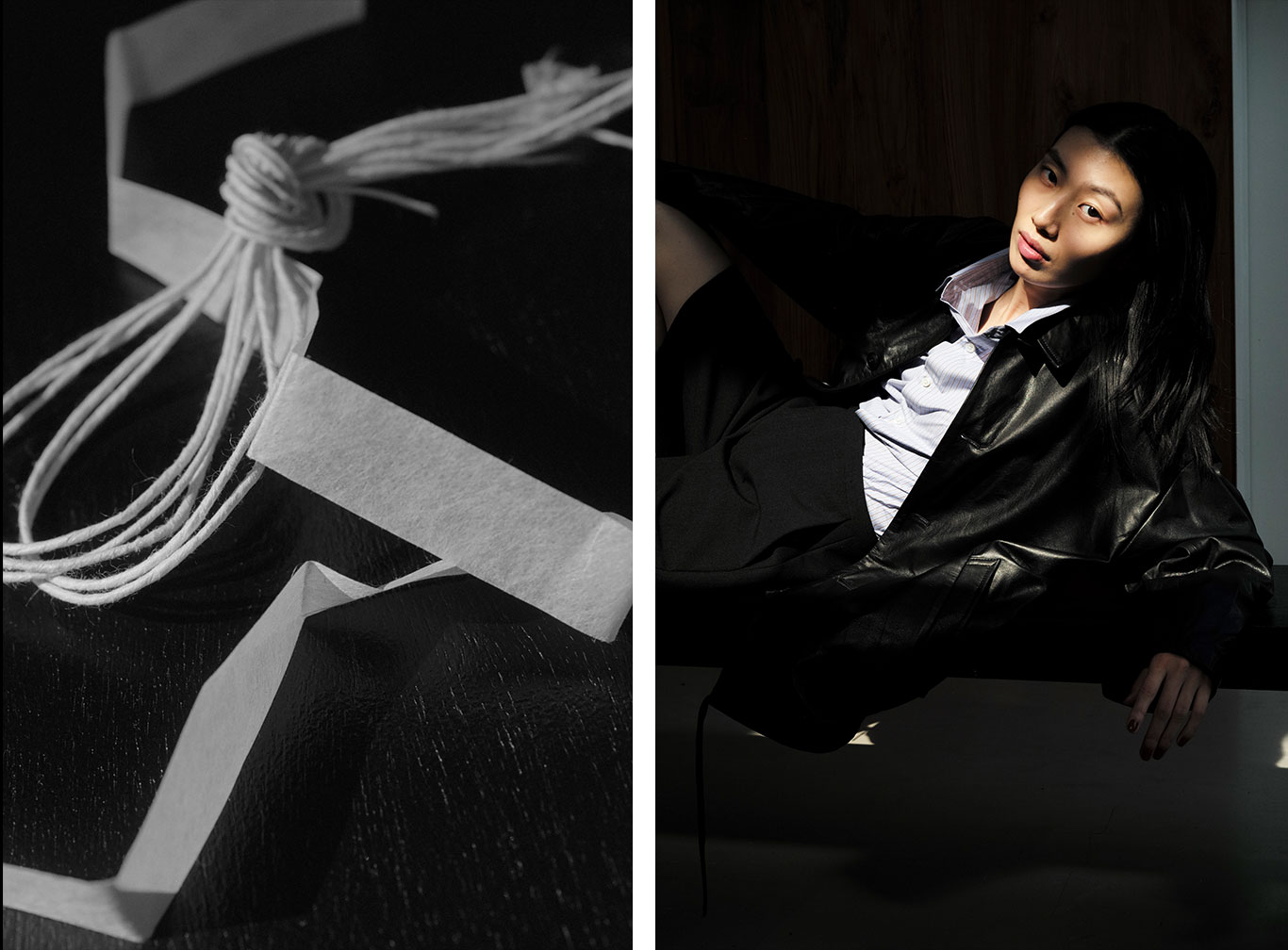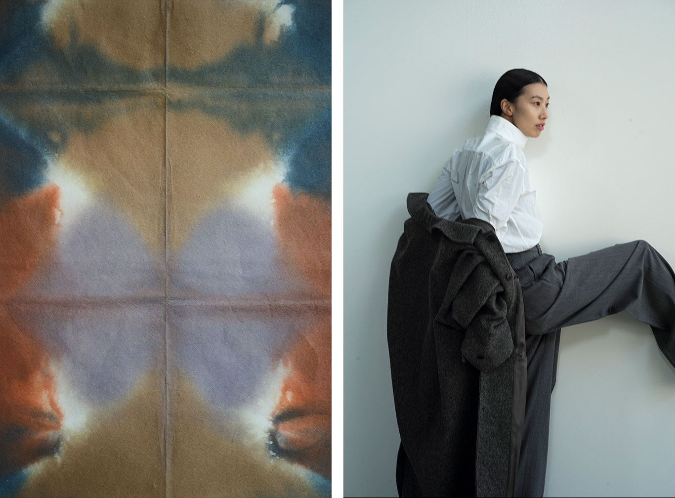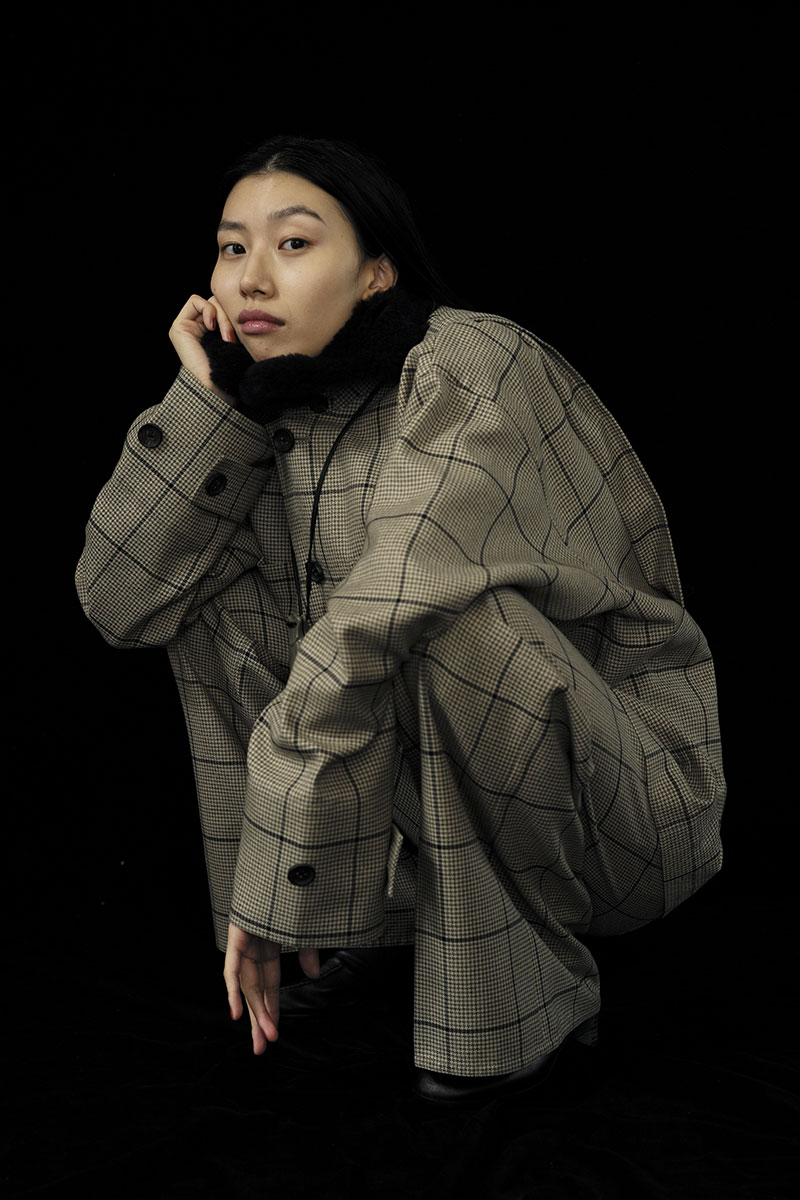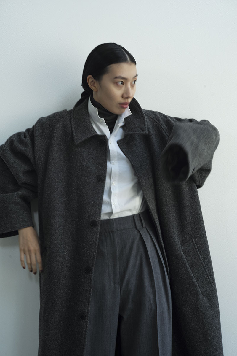 クラシックなウールやレザーに異素材の質感を重ね、伝統と未来が交差する新たなフォルムを描き出す。