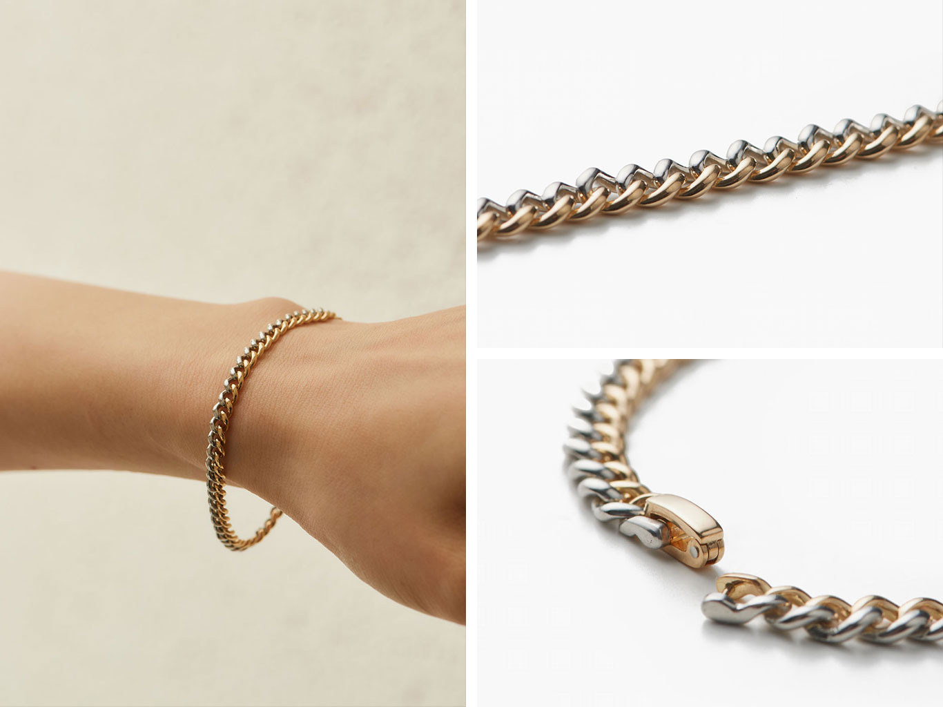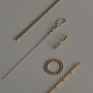 近年、イエローとホワイトのトーンをミックスしたジュエリーコーディネートが主流となる中、このブレスレットはまさに“ハブ”のような存在。異なる素材を繋ぎ、他のジュエリーとのレイヤードを美しく調和させます。光と影、冷たさと温もりが共存するDual Tone。それは、ひとつのスタイルに縛られない自由な感性を映し出す、タイムレスでありながら今を生きるジュエリーです。