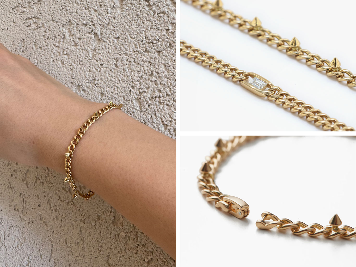 鋭く立ち上がる“棘(Thorns)”と滑らかなチェーンが交錯するブレスレット。原型から鋳造した後、棘の一つひとつを手作業で削り出し、角を磨き上げて形を整えます。マシンメイドの精度と職人の繊細な磨きが融合し、立体的な陰影と柔らかな光を放つ仕上がりに。