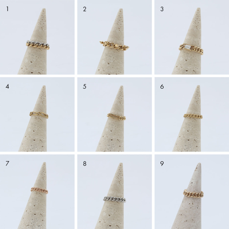 ブレスレットと同じ素材・カラー・デザインで展開され、手元全体に統一感のある輝きをもたらします。チェーンリング同士の重ねづけはもちろん、他ブランドのリングやブレスレットとも自然に調和。ミニマルな構築の中に個性を宿し、コーディネートに奥行きを与える万能な存在です。