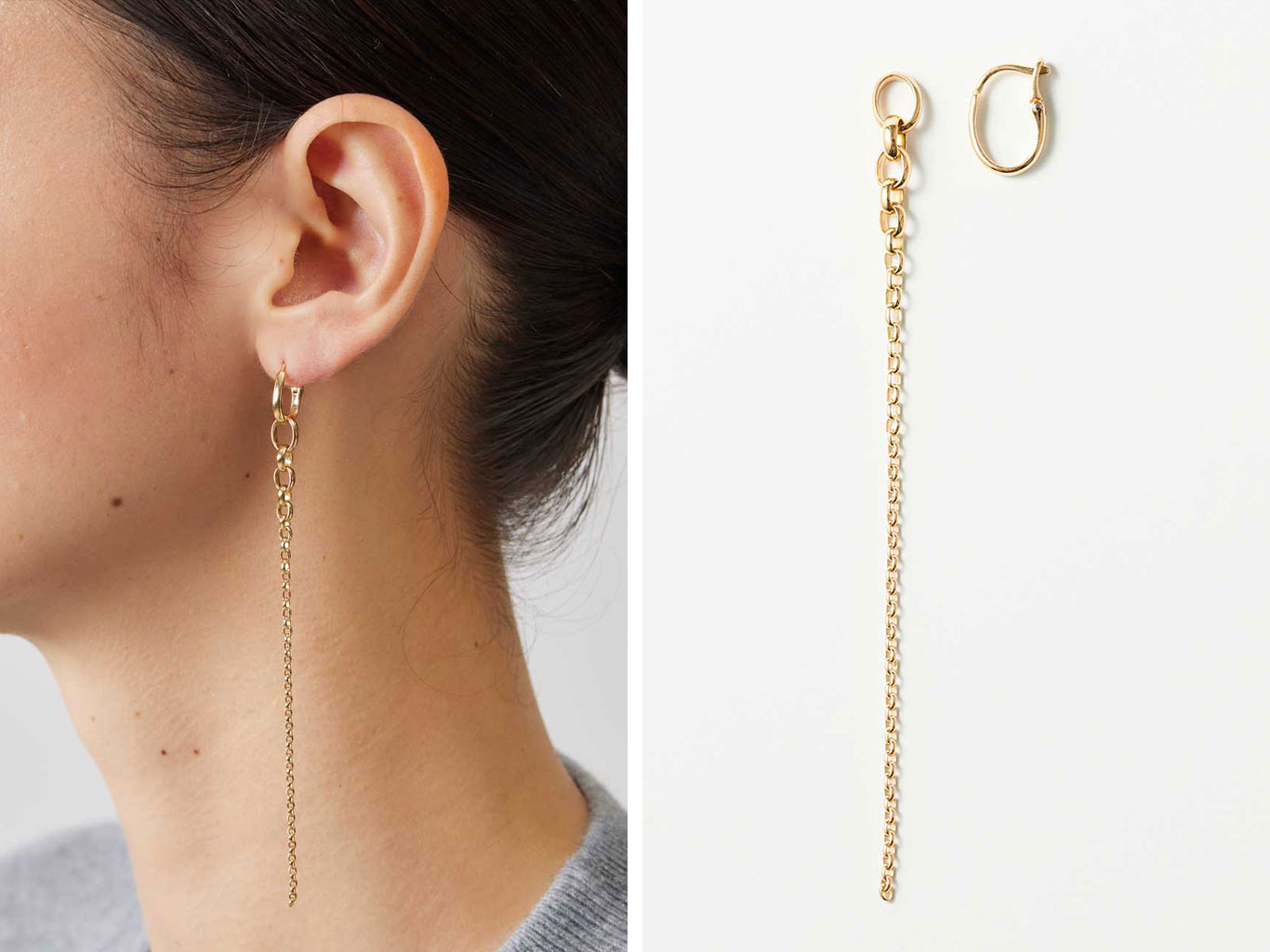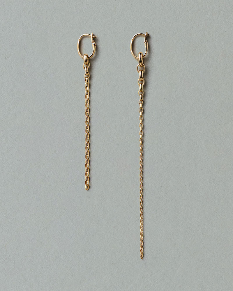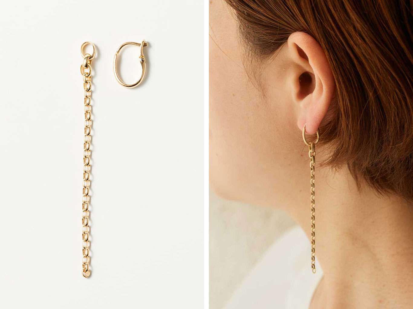 耳元に沿うミニマルなカーブ、繊細に編み上げられたチェーンの揺らぎ。