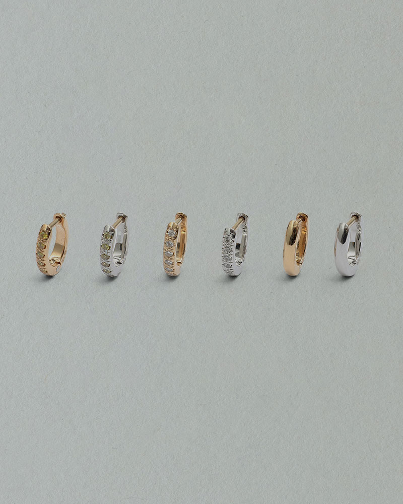 新作〈Mini Arc Hoop With Yellow Diamond〉は、ミニマルなフォルムに天然のイエローダイヤモンドを11石セッティング。人工的に色付けされた「トリート」ではなく、自然な色味を持つ「ナチュラル」のみを厳選使用。明るく澄んだ発色と深みのある黄味がやわらかな輝きを放ち、イエローゴールドにもプラチナにも美しく調和します。