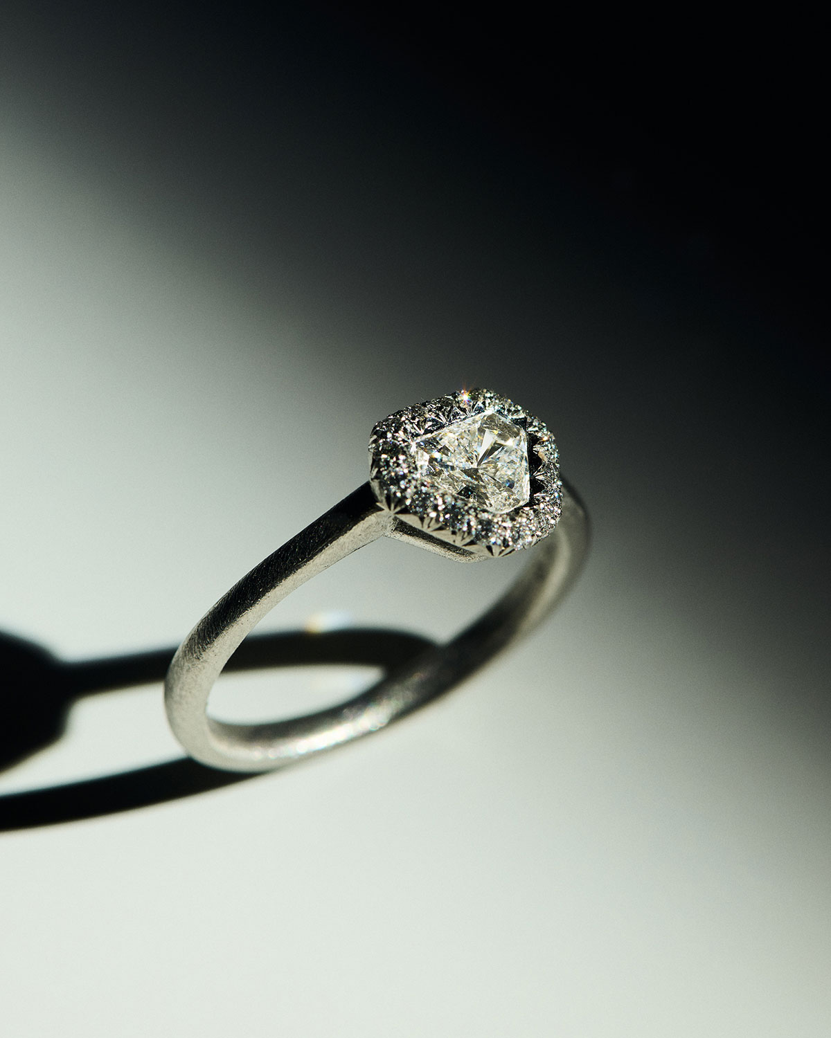 ノーマルなラウンドブリリアントカットとは違い、ローズカットやクッションカット、オールドマインカットなどのユニークな型/カットが施されたダイヤモンドはある種の異質感を放ち、他のブランドとは一線を画したhumらしいソリテールリングに仕上げました。