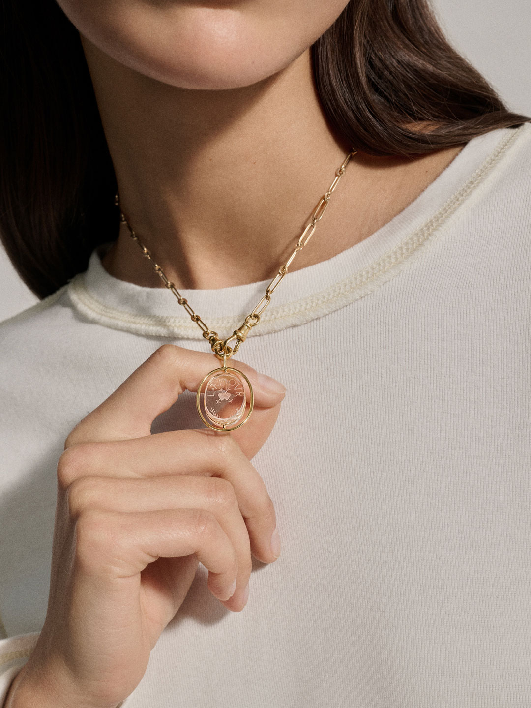 石の内包物や色の揺らぎを魅力として捉え、ゴールドやシルバー、ベークライトなど異素材を繊細に組み合わせたデザインは、フレンチ・シックとボヘミアンの空気を軽やかに融合。デザインはパリ、制作はインド・ジャイプールで行われ、職人の手仕事による温もりを大切にしています。